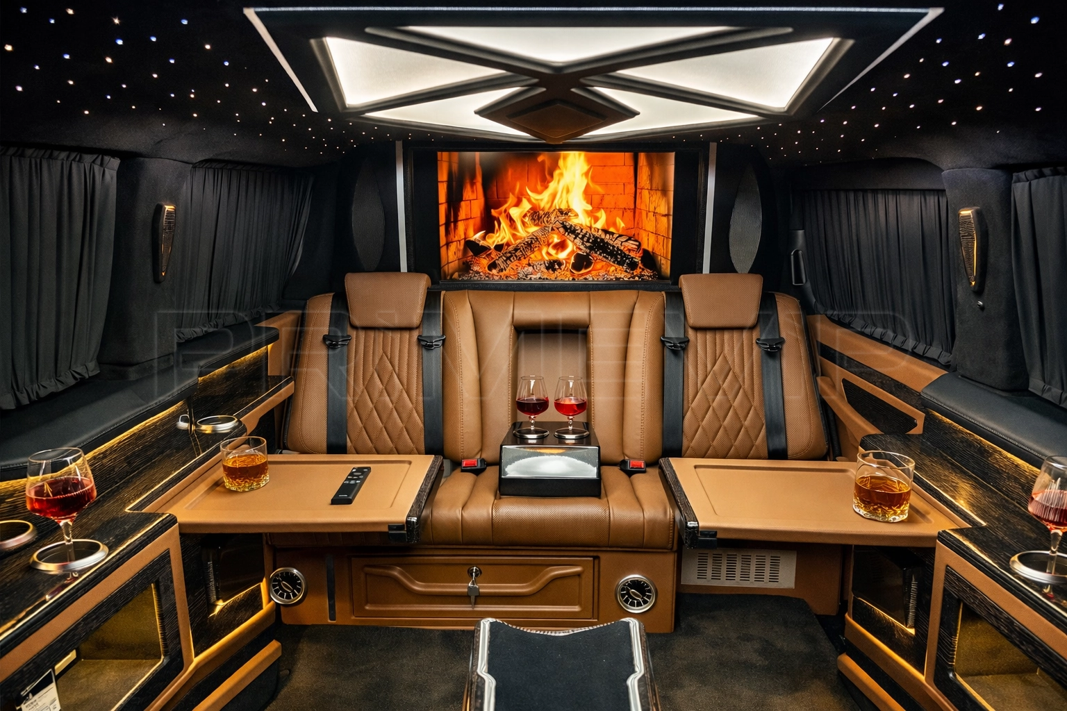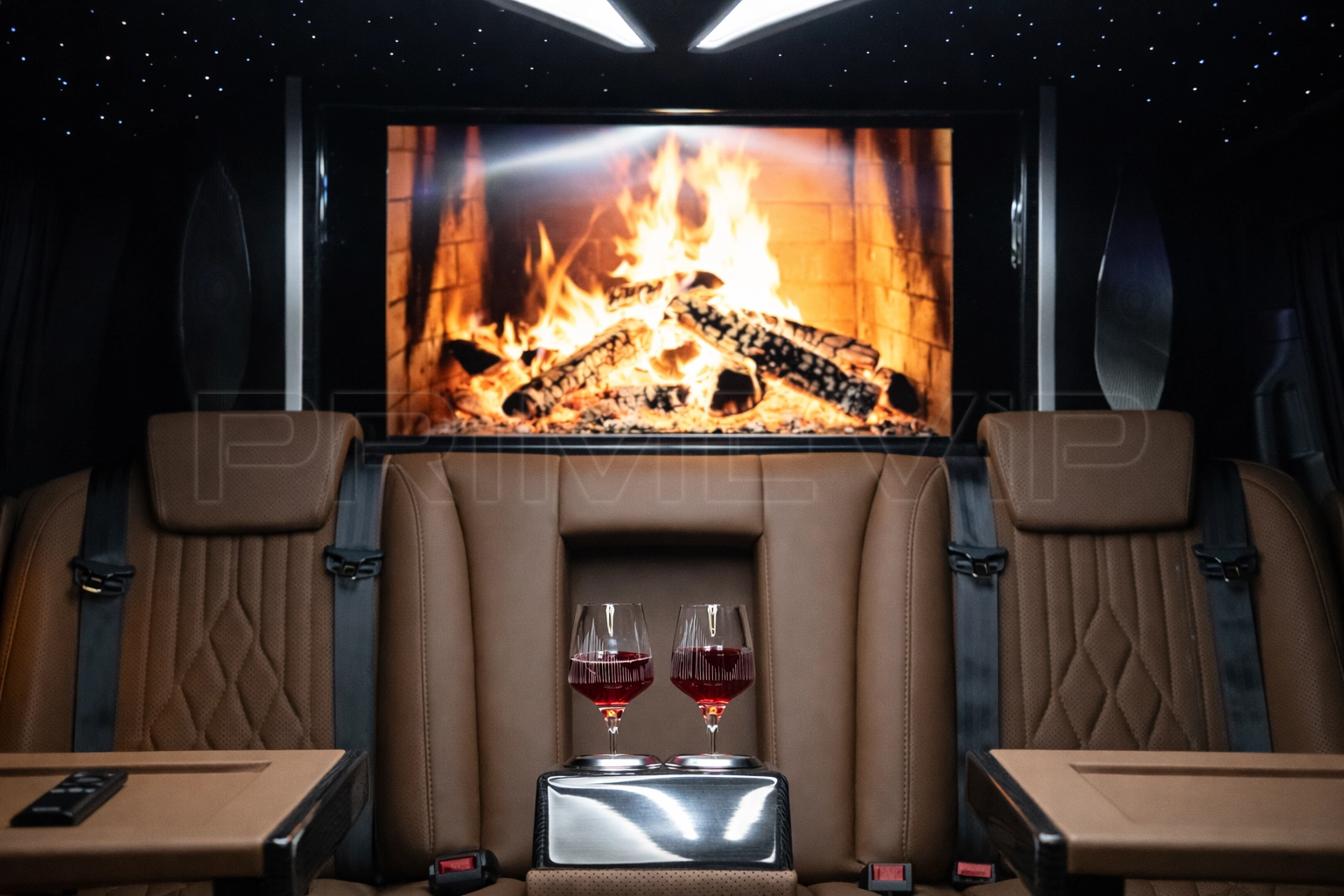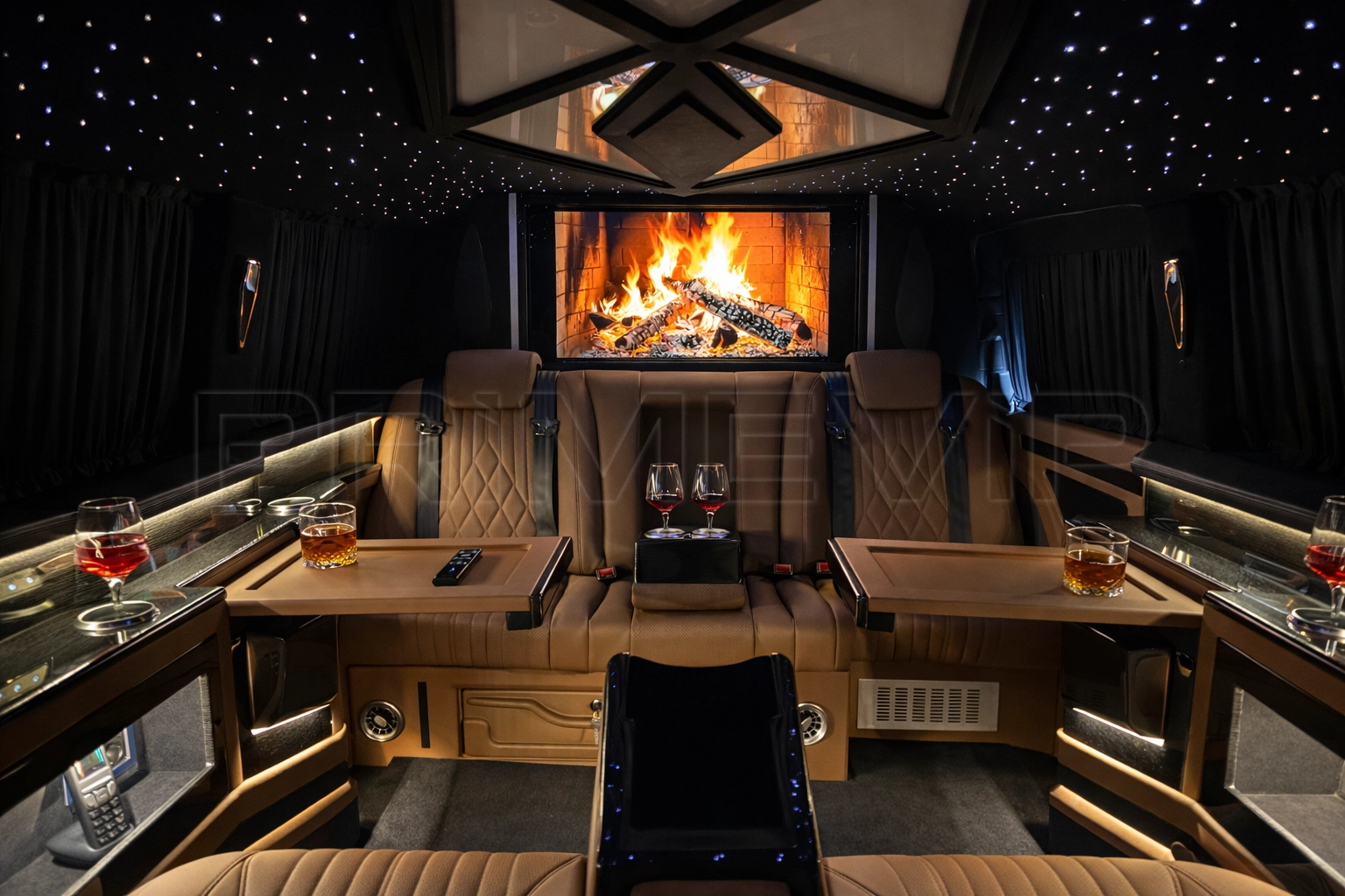Elektrikli asansörlü TV ünitesi, sınırsız 5G internet ve şoförle iletişim için kablosuz telefon sistemi.